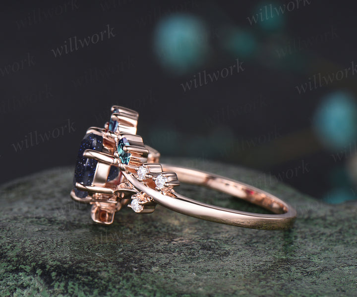 Art Deco Galaxy Blue Sandstone Engagement Ring Alexandrite Moissanite Leaf Vine Twig Branch Nature Inspired Bridal Ring Healing Gift