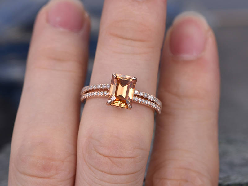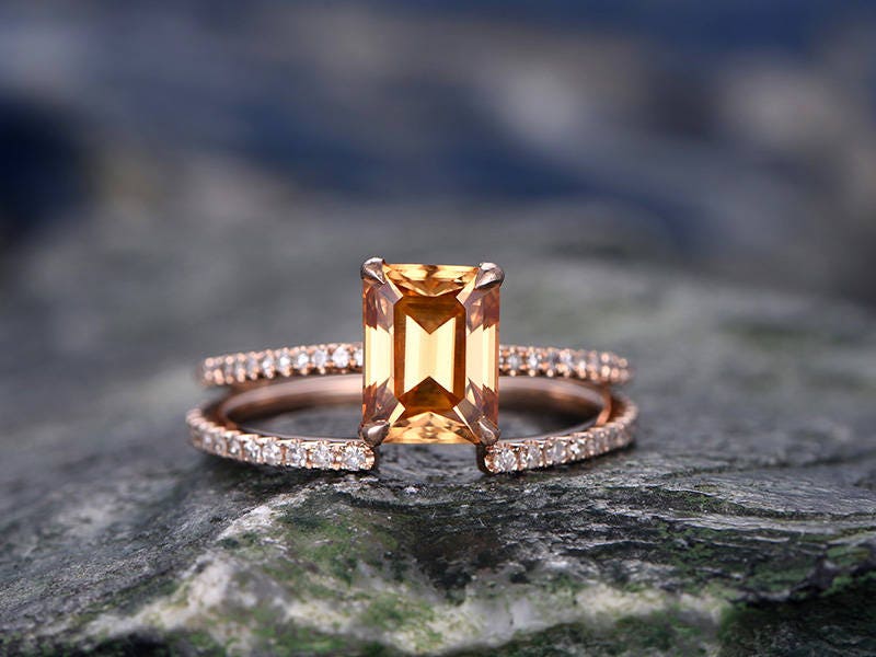 Citrine engagement ring set-Solid 14k rose gold-handmade Diamond Wedding ring-2PC Stacking ring-6x8mm emerald cut gemstone-yellow birthstone