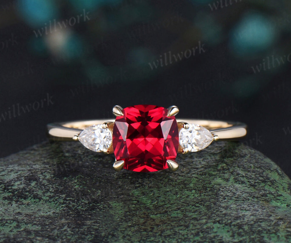 Cushion cut red ruby engagement ring solid 14k yellow gold claw prong three stone pear diamond promise anniversary ring women