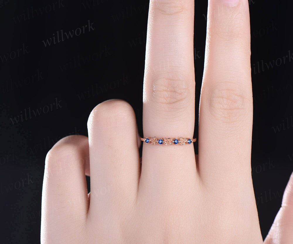 Dainty flower natural sapphire wedding band solid 14k rose gold stacking unique vintage wedding ring band for women anniversary ring gift