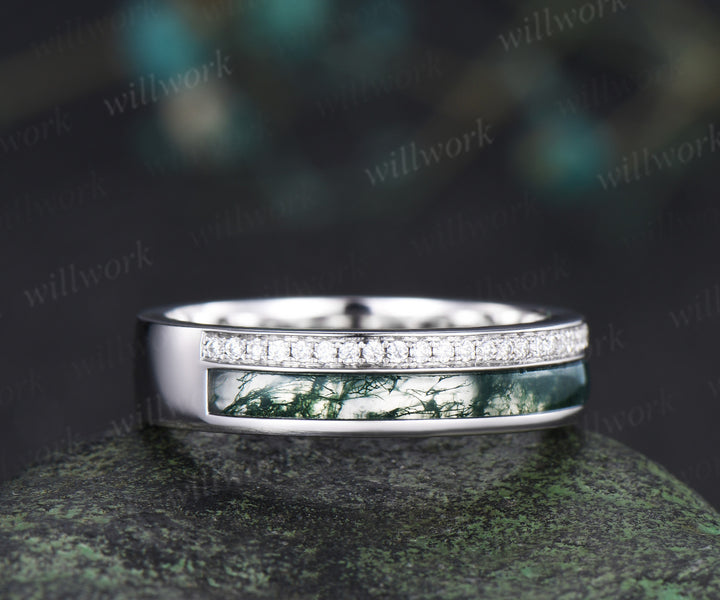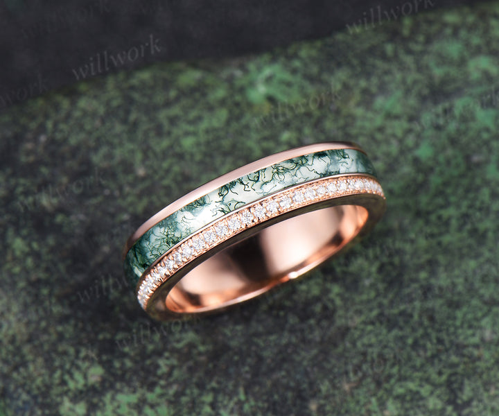 Full eternity bezel moss agate wedding band mens double line moissanite 14k rose gold ring unique engagement bridal ring for husband him