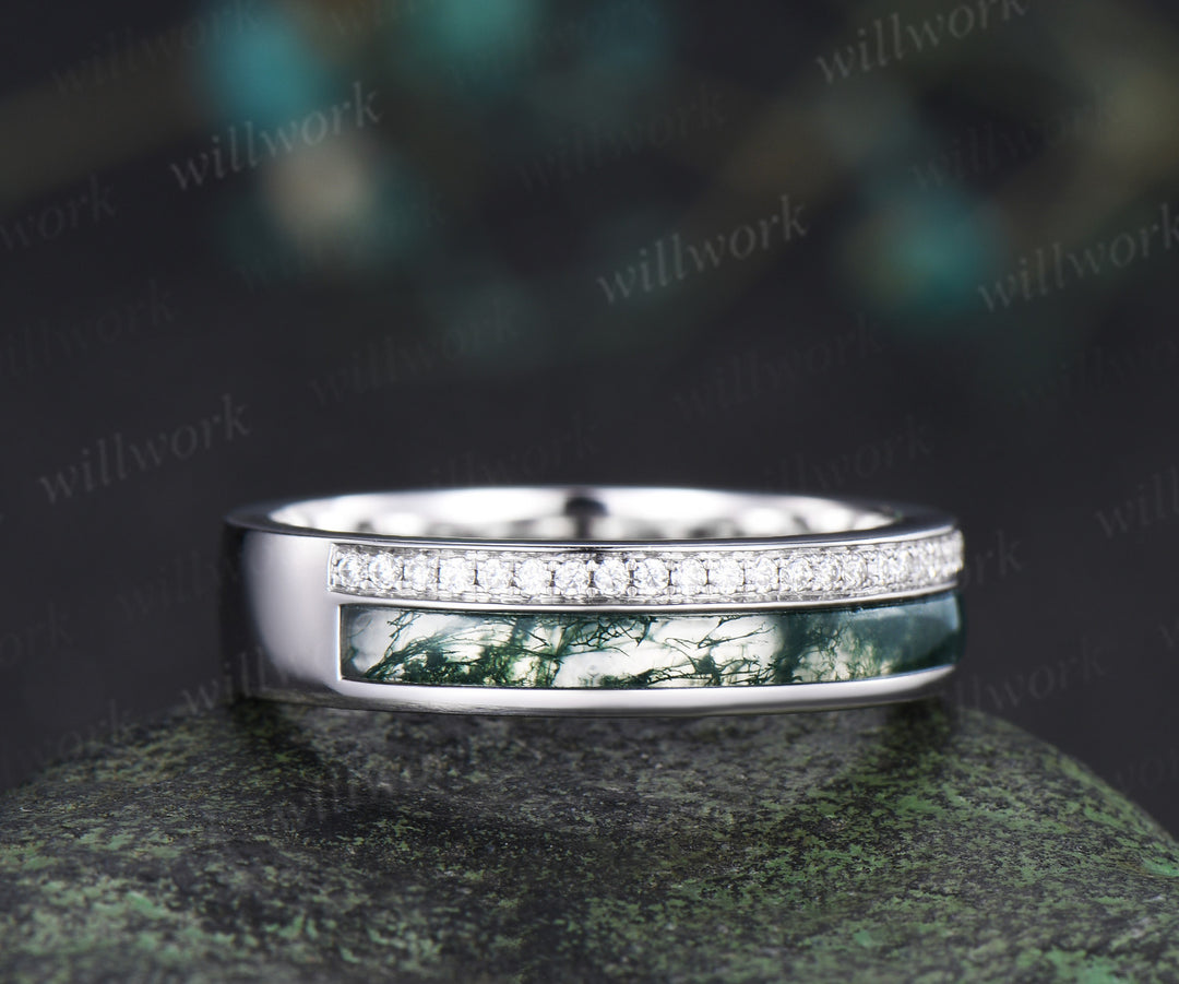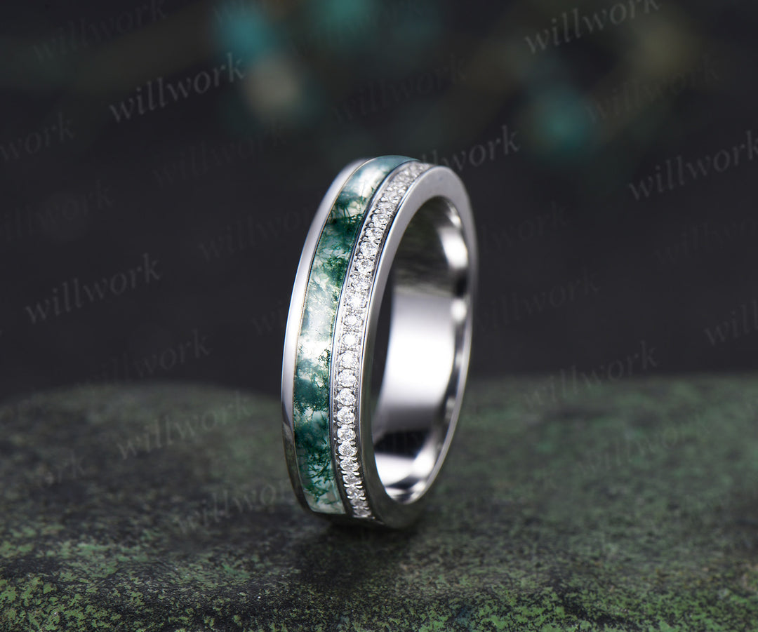Full eternity bezel moss agate wedding band mens double line moissanite 14k rose gold ring unique engagement bridal ring for husband him Full eternity bezel moss agate wedding band mens double line moissanite 14k rose gold ring unique engagement bridal ring for husband him $280.00