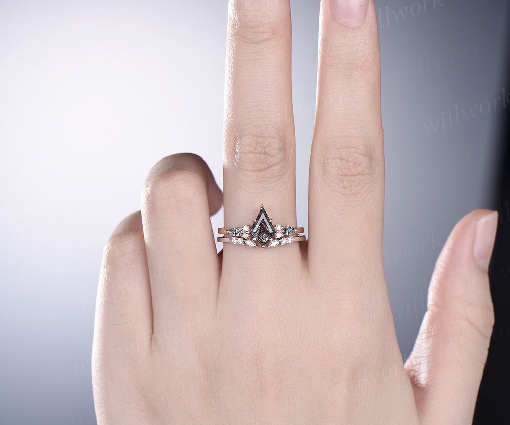 Kite cut black rutilated quartz ring vintage unique engagement ring rose gold marquise cut diamond ring dainty promise bridal ring set women
