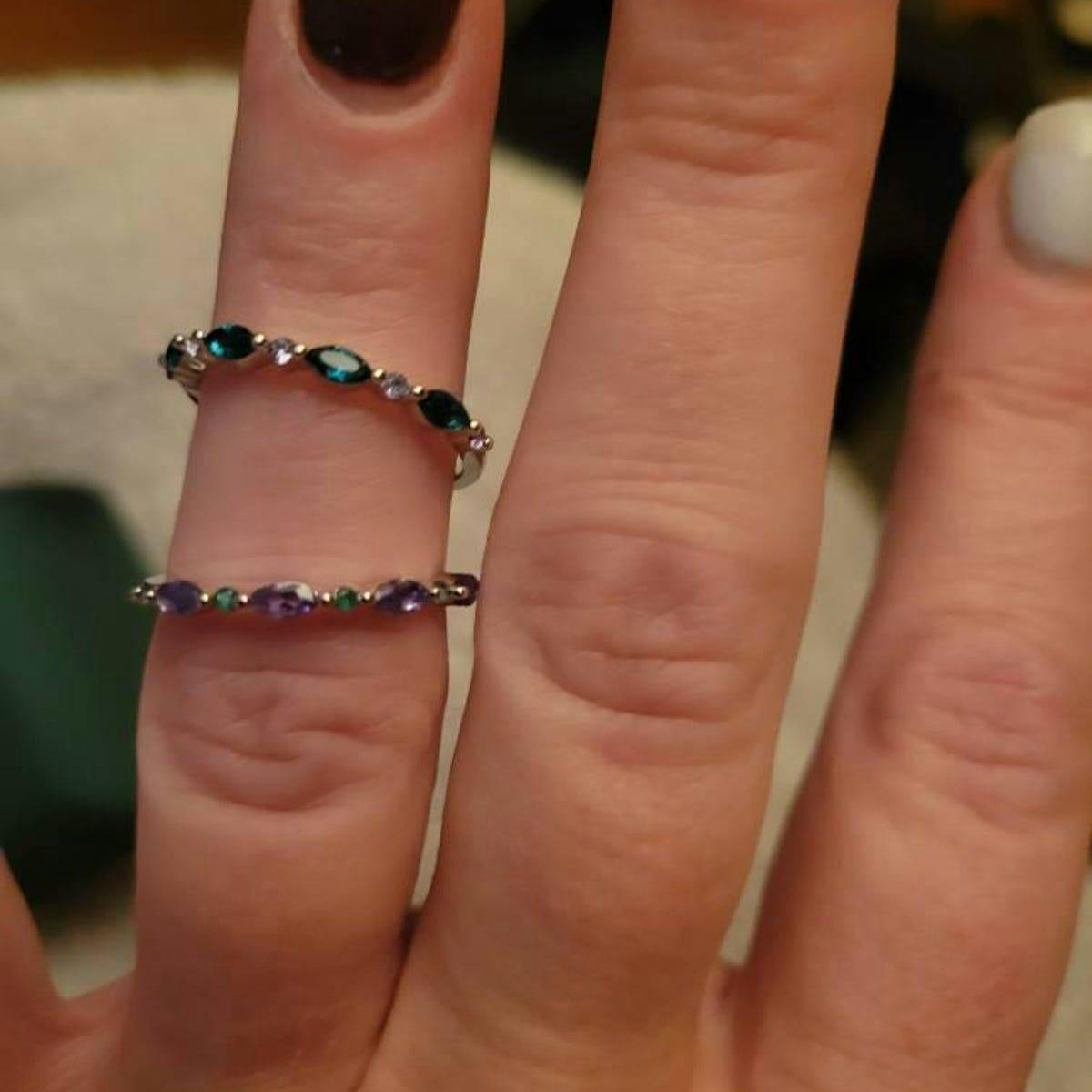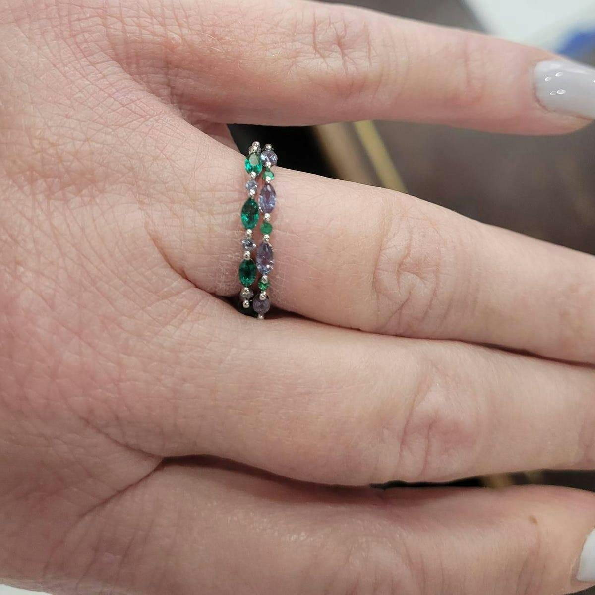 - Stone: 1.5mm round cut natural emeralds and 2x4mm marquise lab alexandrites
