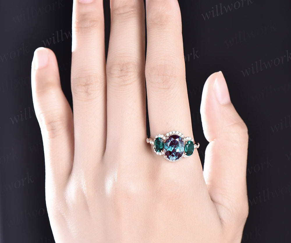 Oval cut Alexandrite engagement ring rose gold art deco vintage unique engagement ring holo moissanite wedding ring for women fine jewelry