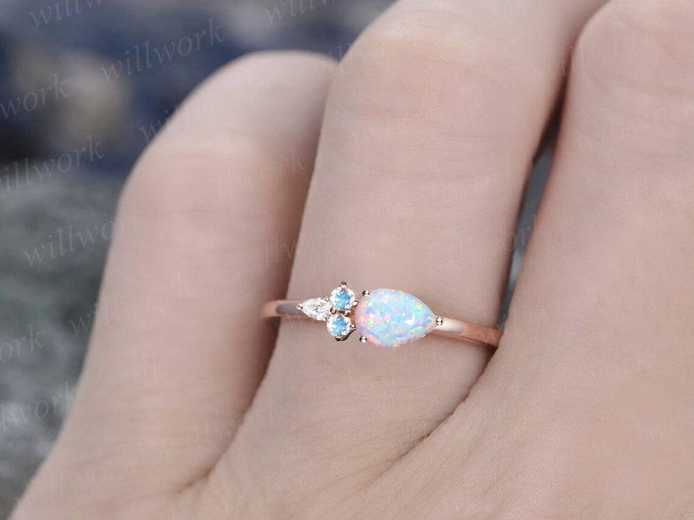 Pear shaped opal ring vintage five stone East To West unique opal engagement ring 14k rose gold dainty moonstone bridal ring for women gift