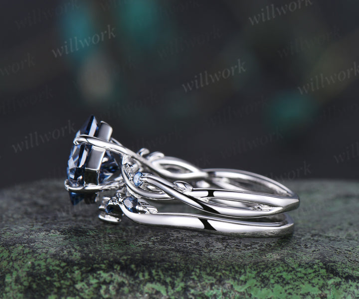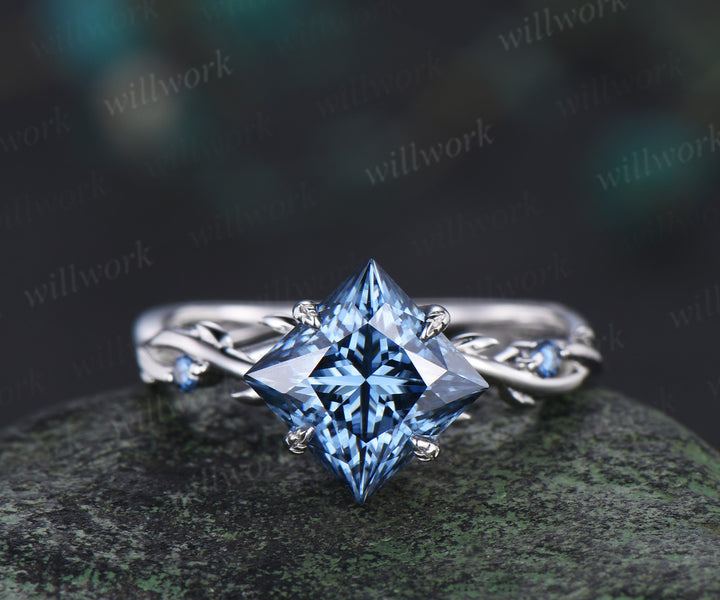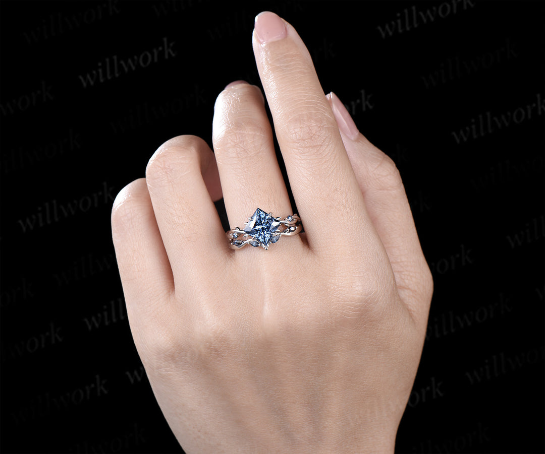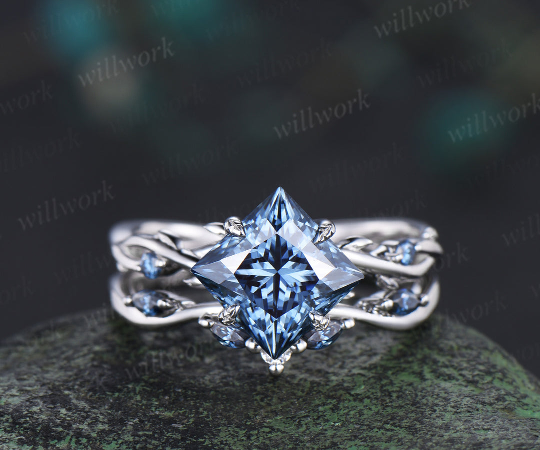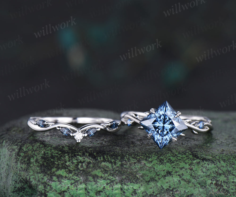 Princess cut blue moissanite engagement ring set 18k white gold infinity leaf prong unique wedding ring set women