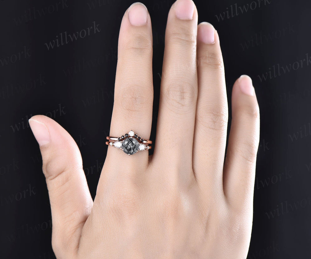 Round cut black rutilated quartz engagement ring set 14k rose gold five stone moissanite ring black diamond ring for women wedding ring set