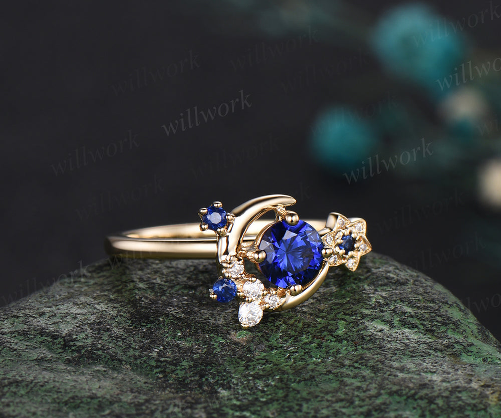 Round cut blue sapphire ring yellow gold vintage star moon cluster engagement ring women gemstone gift