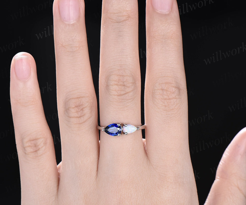 Toi et Moi pear sapphire ring white gold white opal ring vintage Minimalist unique engagement ring dainty gemstone anniversary ring women