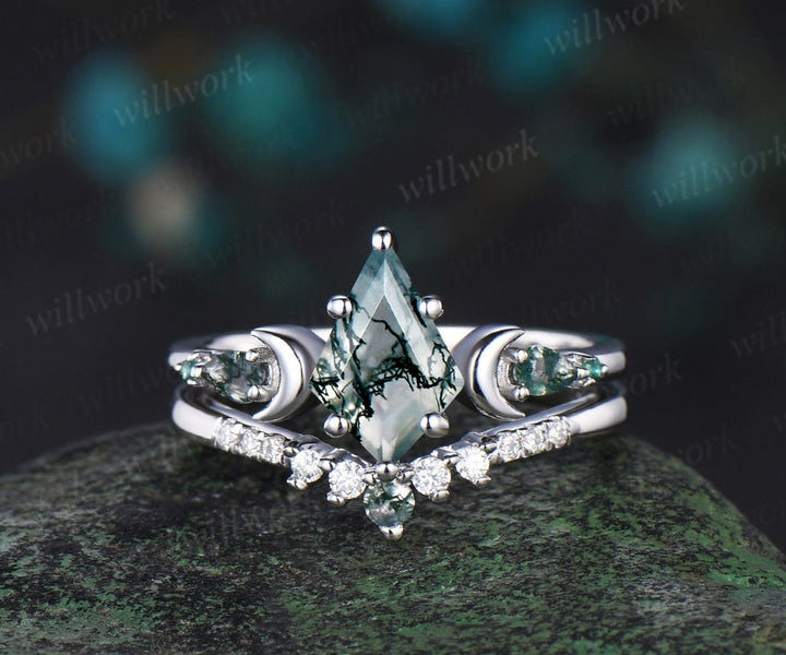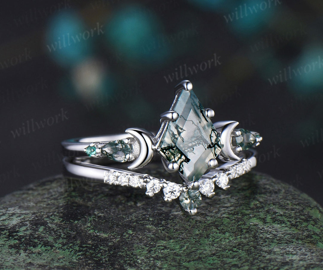 Unique kite cut moss agate engagement ring set women rose gold 6 prong five stone moon bridal ring set