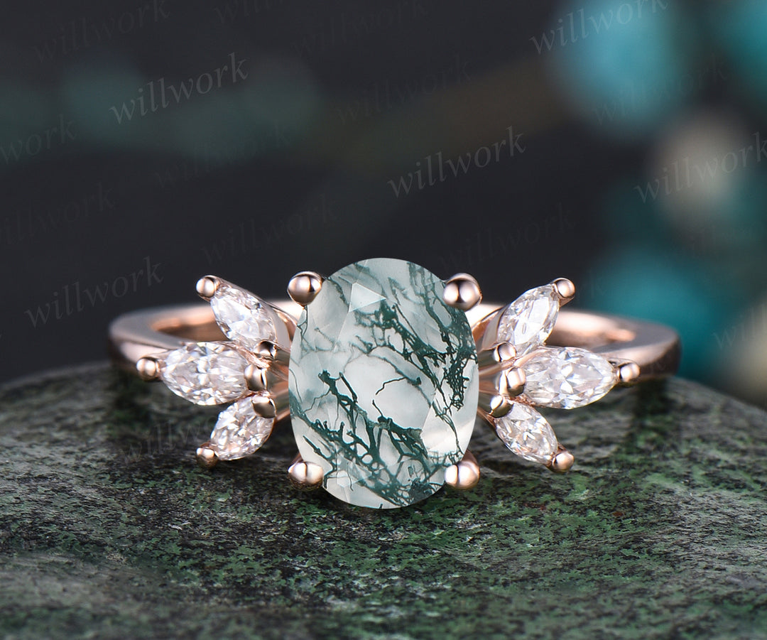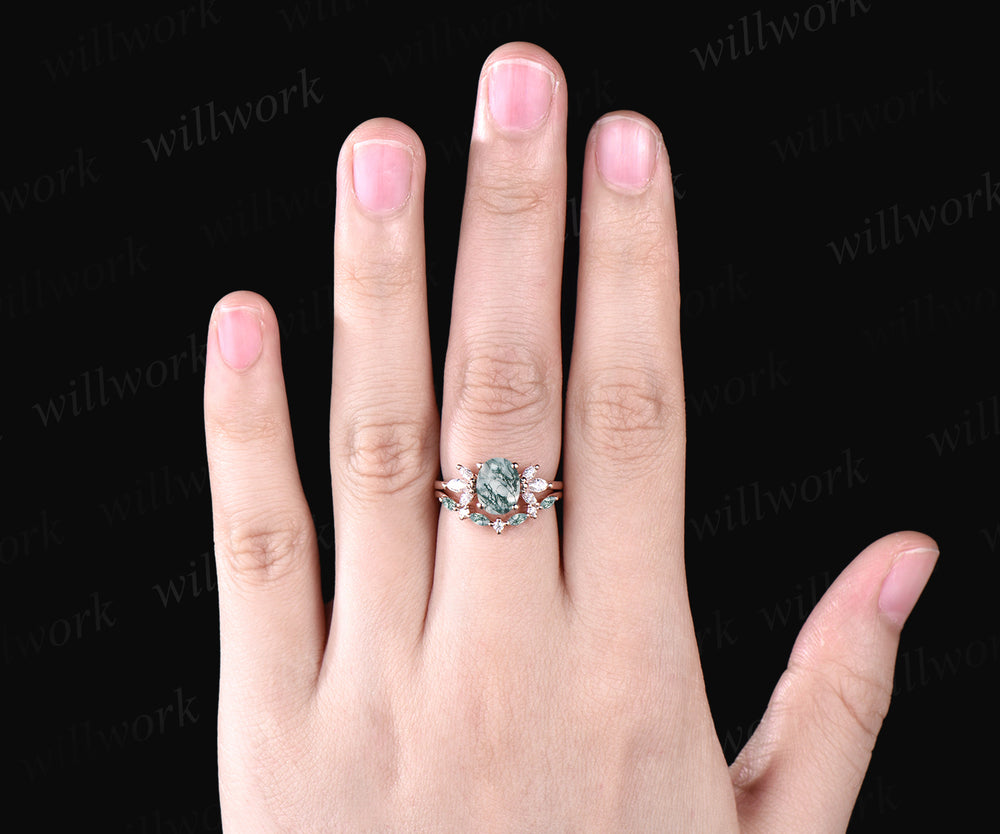 Unique Oval Cut Natural Green Moss Agate Engagement Ring Set 14k Rose Gold Seven Stone Green Gemstone Moissanite Cluster 2pcs Bridal Ring Set Unique Oval Cut Natural Green Moss Agate Engagement Ring Set 14k Rose Gold Seven Stone Green Gemstone Moissanite Cluster 2pcs Bridal Ring Set $275.00