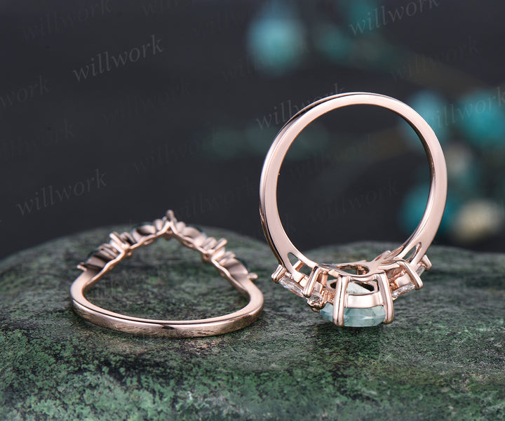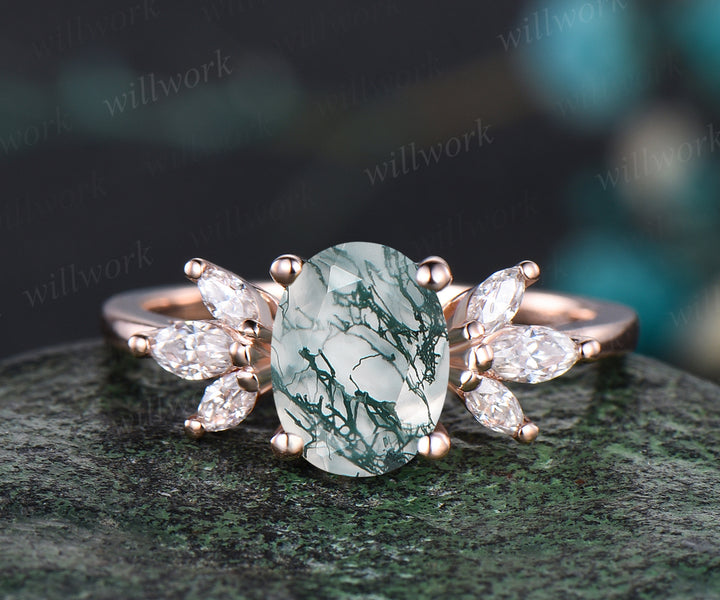 Unique Oval Cut Natural Green Moss Agate Engagement Ring Set 14k Rose Gold Seven Stone Green Gemstone Moissanite Cluster 2pcs Bridal Ring Set