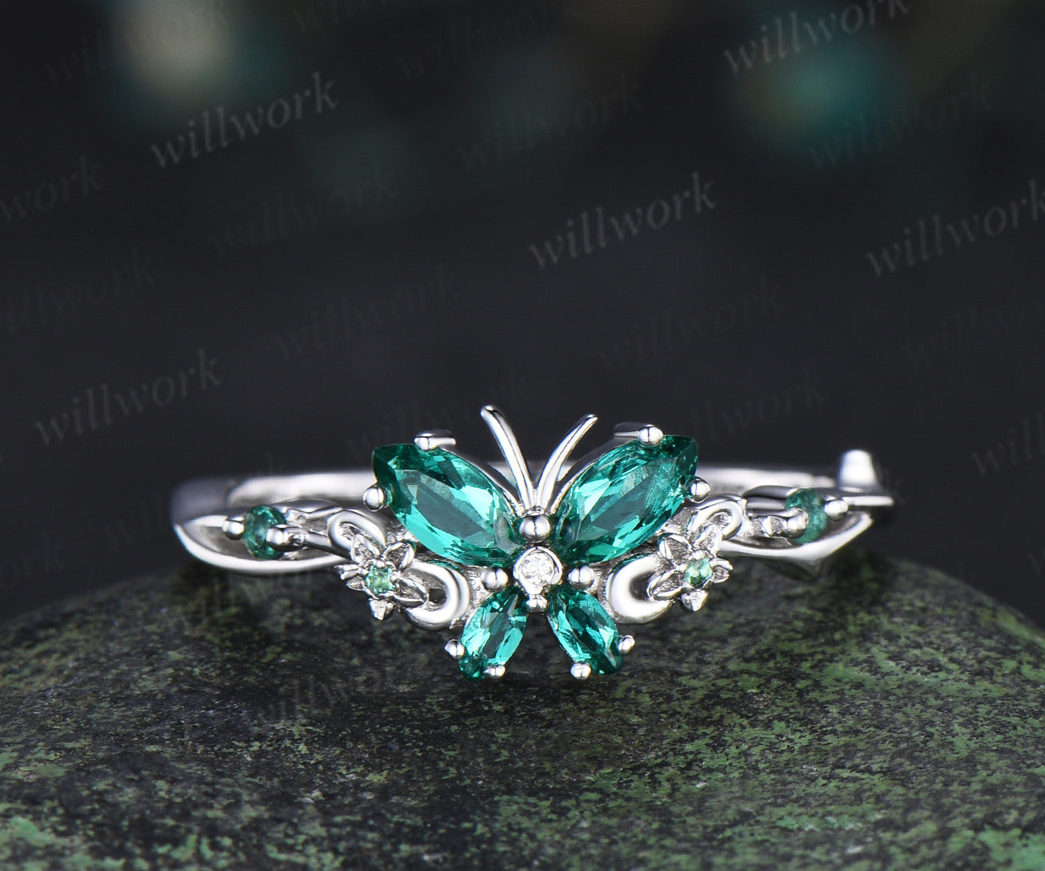 ***A romantic butterfly marquise emerald engagement ring, where vivid green emerald blooms like spring and the butterfly whispers of transformation and eternal love. Vintage floral artistry meets timeless elegance, creating a unique bridal ring and heartfelt gift for her.***- Metal: Solid gold(10K/14K/18K white/yellow/rose gold),925 sterling silver,platinum available