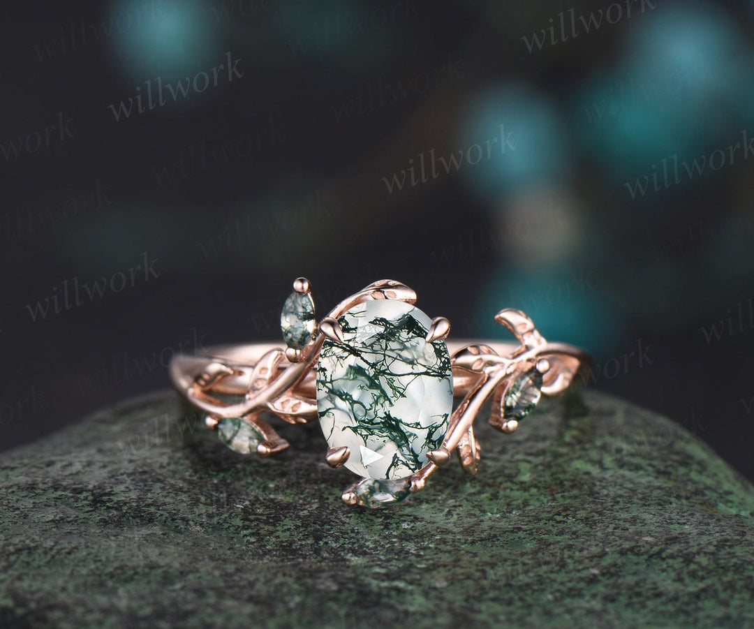 ***Our moss agate ring is inspired by nature. Each moss agate is unique, entwined by vines, leaves and small moss agates, just like a bride surrounded by love and blessings, blooming her own unique beauty in the crowd.***- Metal: Solid gold(10K/14K/18K white/yellow/rose gold),925 sterling silver,platinum available