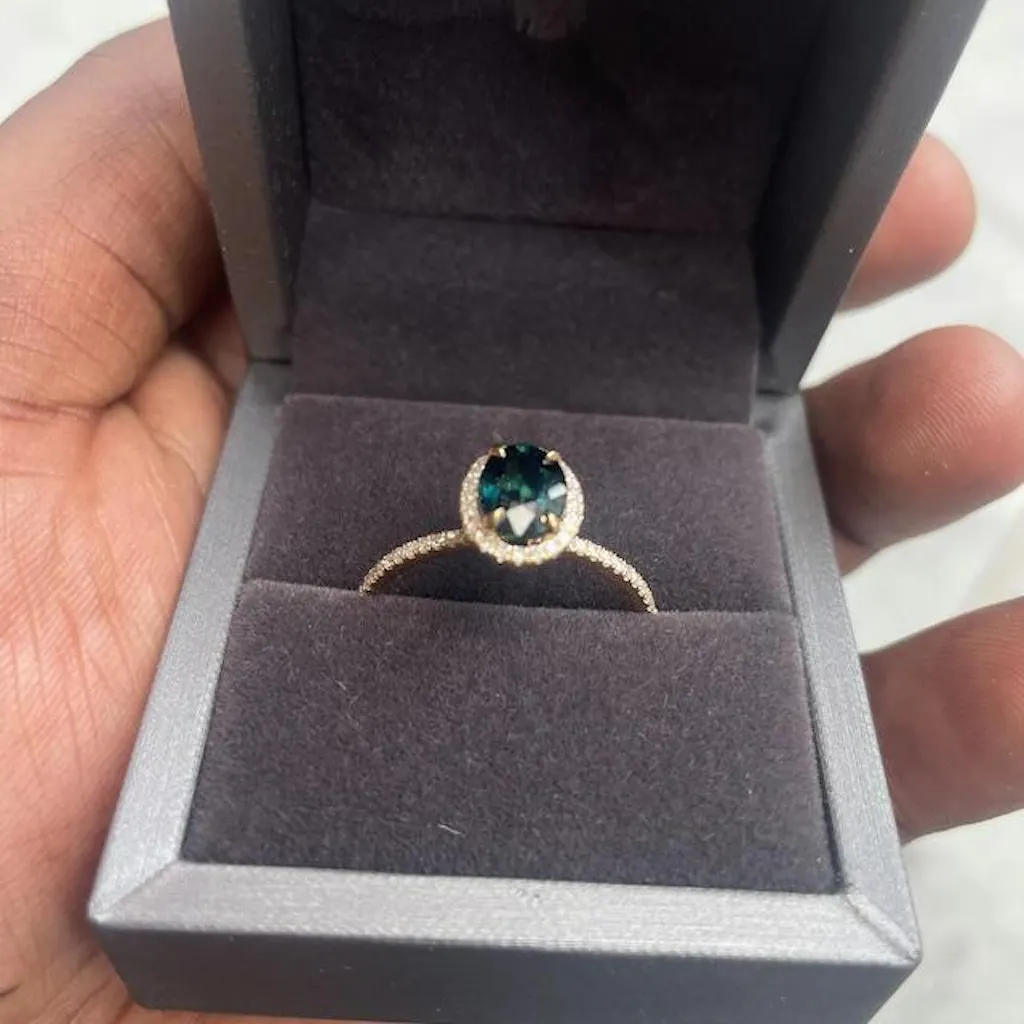 - Main Stone: 6x8mm Oval cut lab-grown teal green sapphire