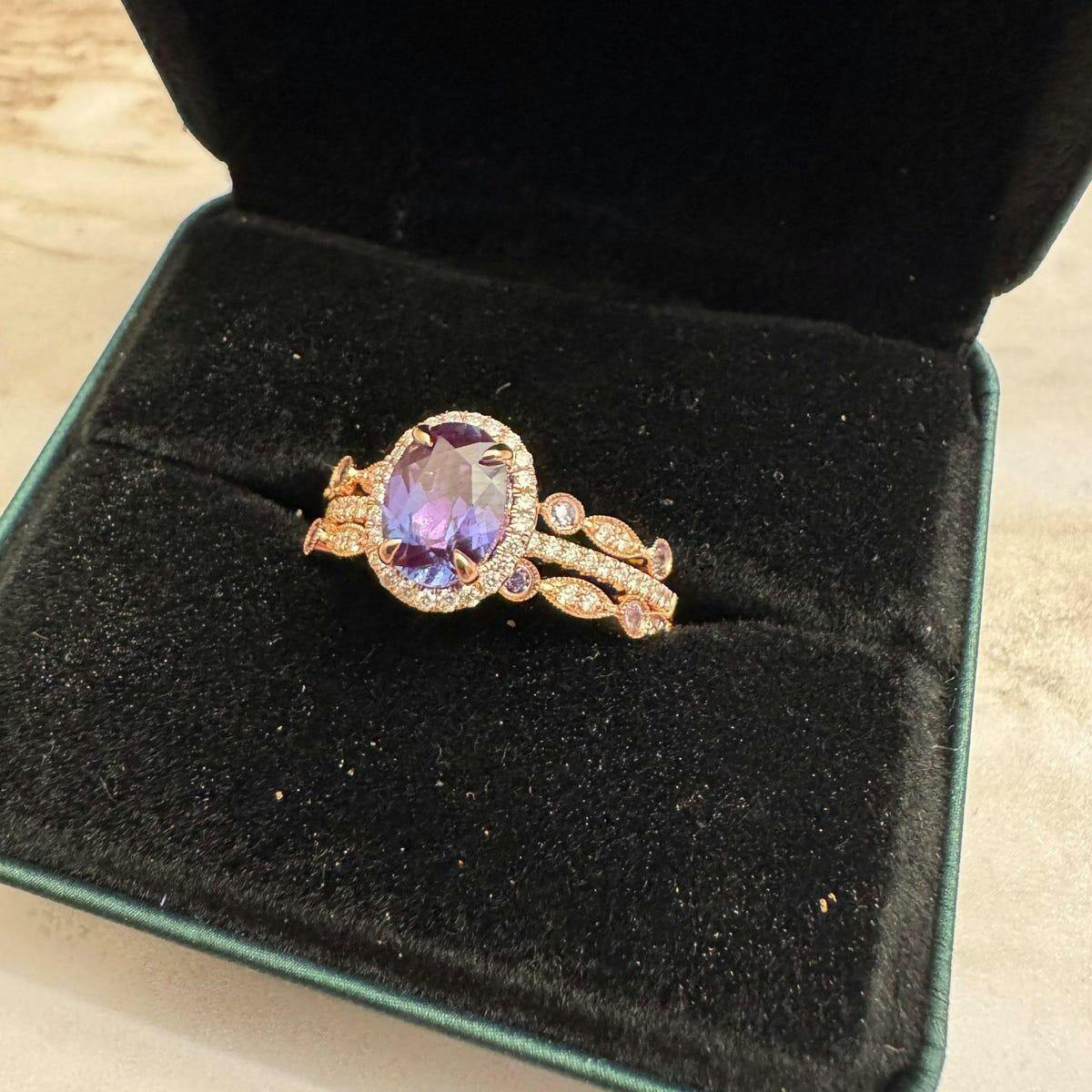 Vintage Unique oval cut Alexandrite engagement ring set rose gold ring set halo diamond ring set art deco bridal wedding ring set for women