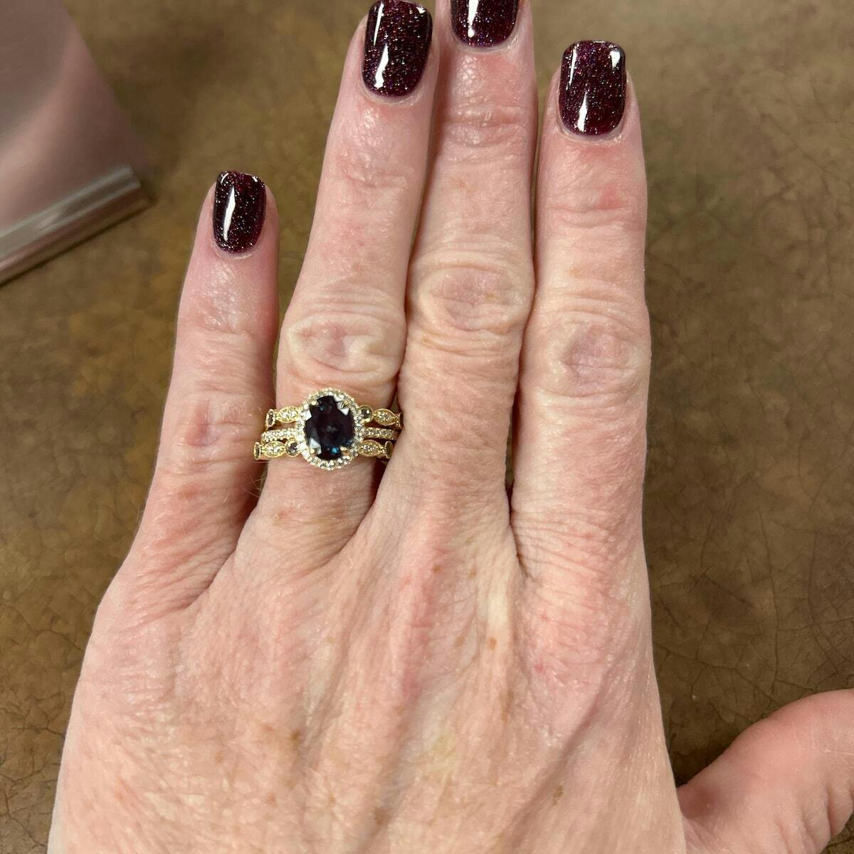 - Main Stone: 6x8mm Oval cut Lab treated Alexandrite