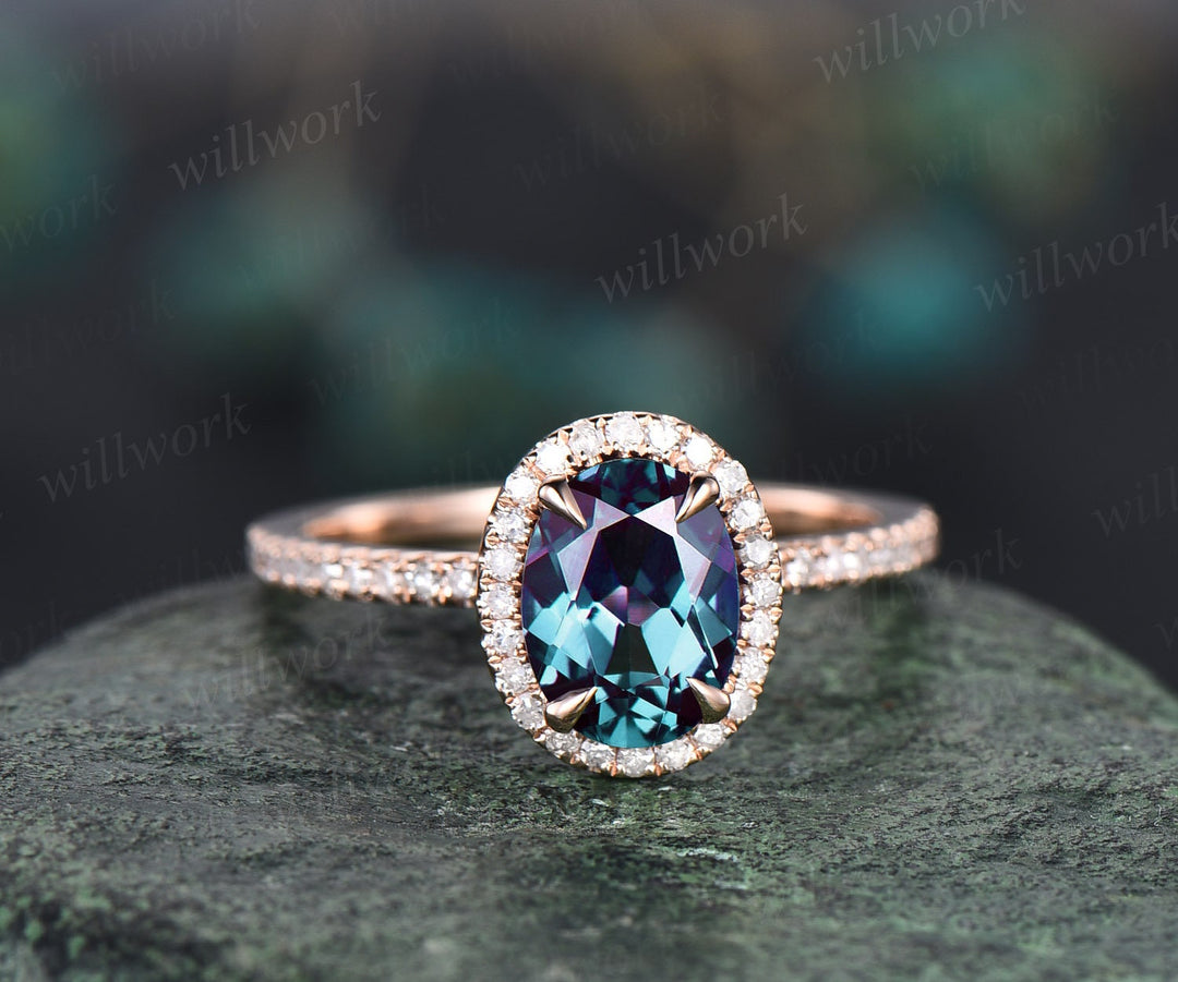 Vintage Unique oval cut Alexandrite engagement ring set rose gold ring set halo diamond ring set art deco bridal wedding ring set for women