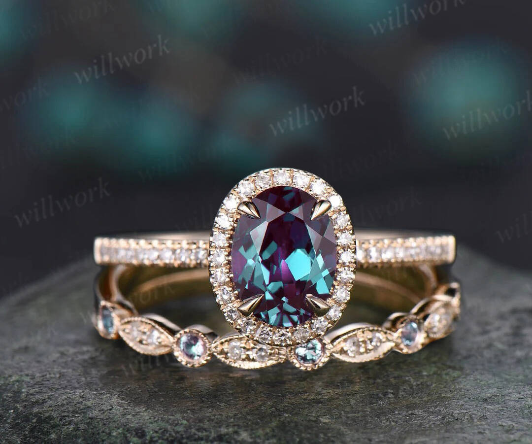 Vintage Unique oval cut Alexandrite engagement ring set rose gold ring set halo diamond ring set art deco bridal wedding ring set for women